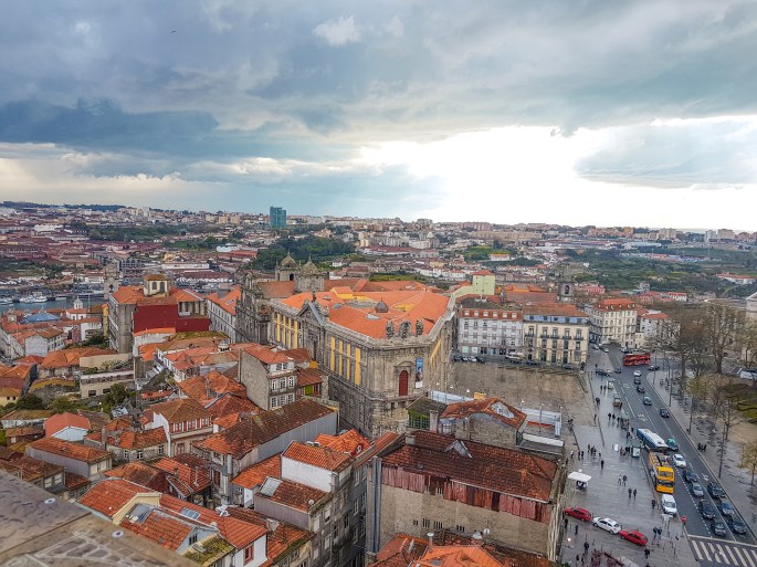 Esta foto mostra a vista da frente da torre, com o Rio Douro à esquerda, a Antiga Cadeia da Relação do Porto, que hoje abriga o Centro Português de Fotografia (prédio amarelo), o Jardim da Cordoaria e a Reitoria da Universidade do Porto.