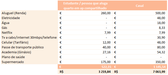 Em resumo, cheguei ao custo de vida mensal de € 522,15 para um estudante ou trabalhador que divida apartamento com outras pessoas, e € 1145,54 para um casal, que alugue um T1. Vejam mais detalhes aqui: